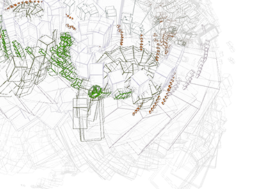 One of my most successful forays into procedural geometry creation, this form was created in Structure Synth, exported to Maya for rendering, and then composited in Nuke. The mostly-monochrome image is an anaglyph, if you have glasses handy.
